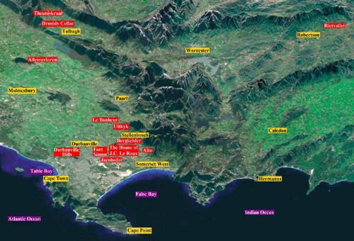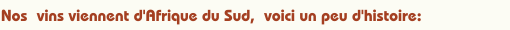 L’Histoire du vin en Afrique du Sud commence quasiment avec celle des premiers immigrants sur le grand territoire. Bartolomeu Dias contourne le Cap et le nomme du joli nom de "Cao da Boa Esperança" en 1487. Dix ans plus tard Vasco de Gamma y passe à son tour, en faisant route vers les Indes. Fin XVII, Anglais et Hollandais s'arrêtent au Cap pour ravitailler les navires, la Compagnie hollandaise des Indes Orientales (VOC) est alors créée. Jan Van Riebeeck, gouverneur du Cap plante déjà quelques cèpes de vigne. De nombreux immigrants (Hollandais, Allemands, Huguenots Français calvinistes) vont suivre et continuer à développer la colonie. Pas très nombreux au regard des autres arrivants, persécutés parce que protestants, ce sont environs deux cent français huguenots qui fuirent la France après la révocation de l’Edit de Nantes. Ils quittent leur région, leur pays et s’embarquent dans les brumes d’Amsterdam sur les bateaux de la Compagnie des Indes en route vers le grand Sud, emportant leurs histoires propres et leurs racines pour s’installer sous d’autres cieux. Le dépaysement ne sera pas trop brutal, peut on s’imaginer, en arrivant au Cap où le climat méditerranéen n'est pas sans leur rappeler leurs terres, leur patrimoine perdus advitam mais dont ils conserveront pour toujours le souvenir et duquel ils tireront la force de recommencer gràce à leur formidable esprit d'aventure, une nouvelle vie sur ce bout du monde accueillant pour en faire un nouveau continent du vin.